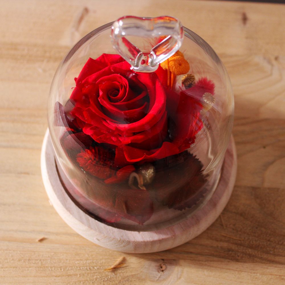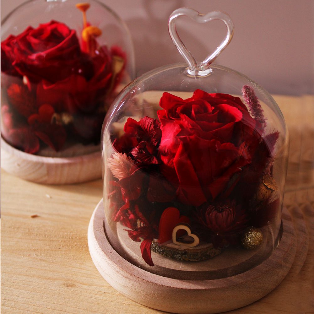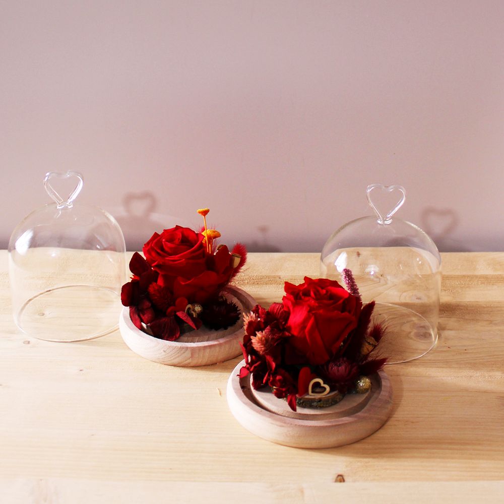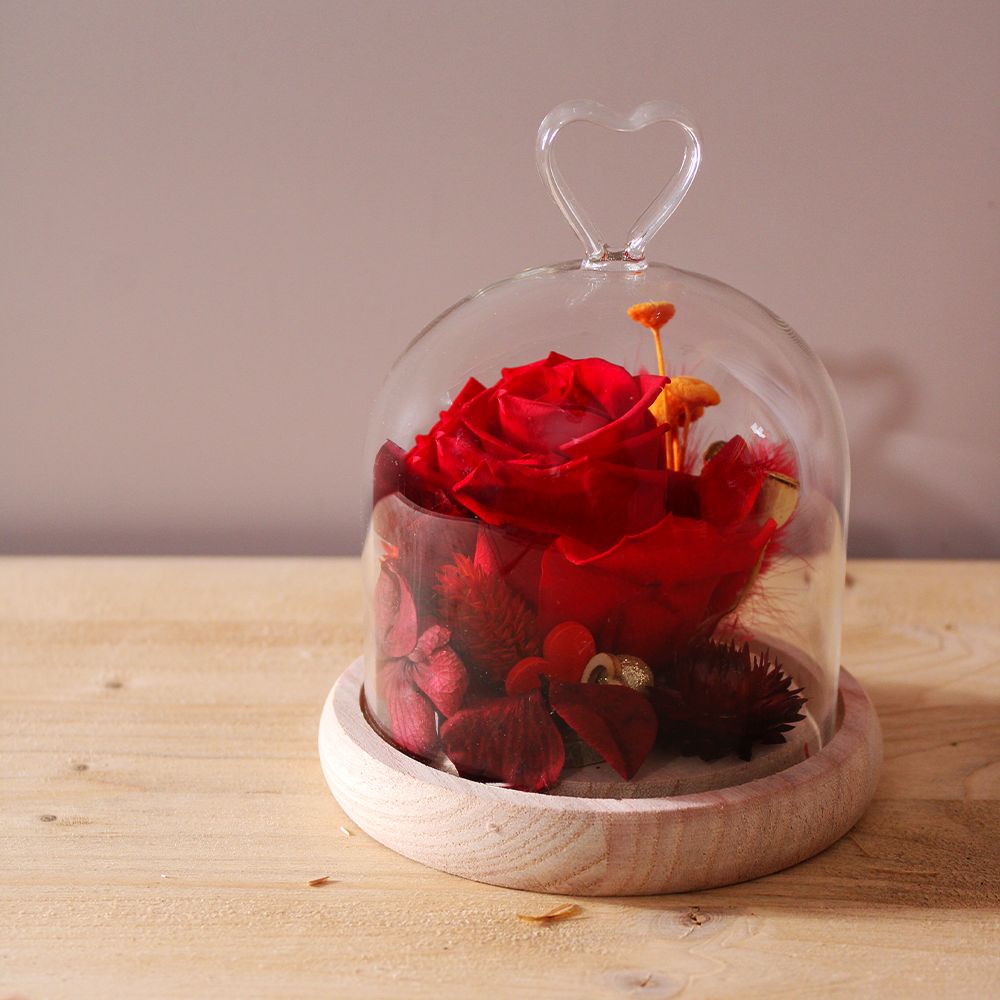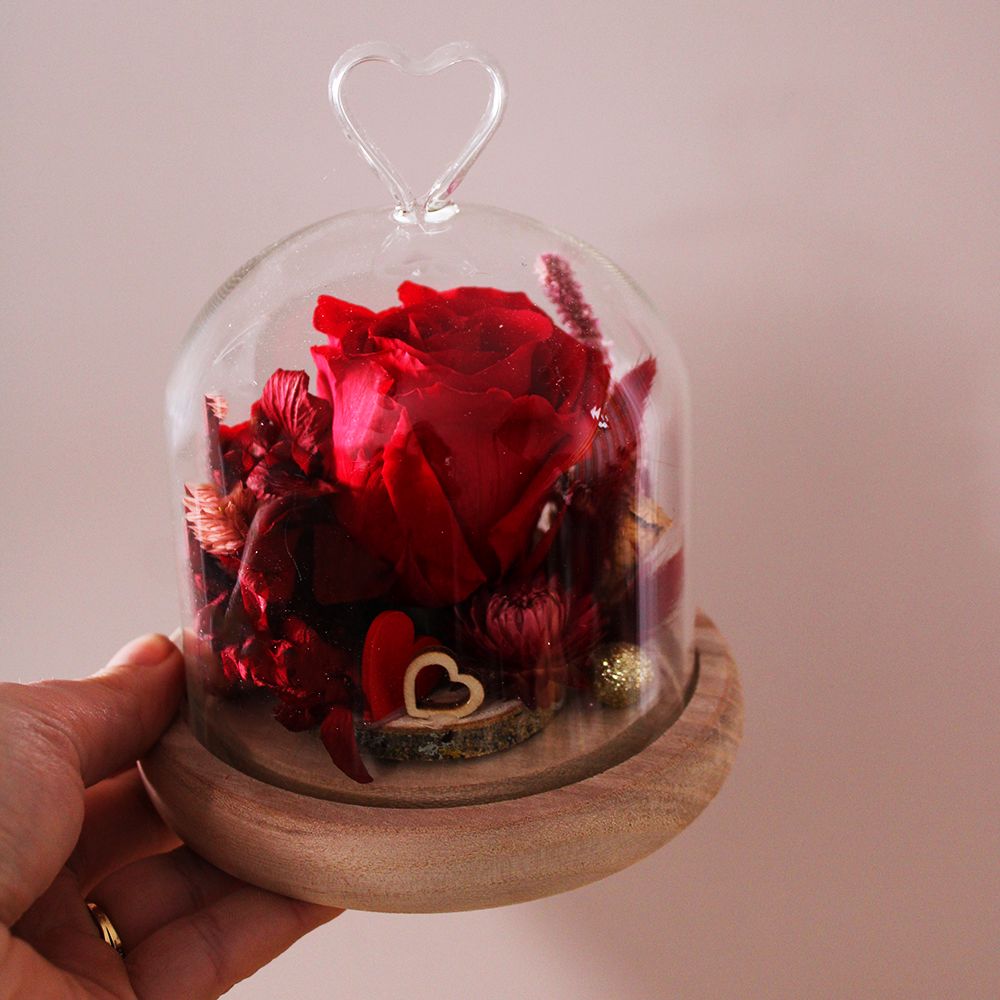 Le jardin secret Douce Évasion est réalisée à partir d’une rose rouge stabilisée et de fleurs séchées soigneusement sélectionnées pour leur qualité et leur harmonie.