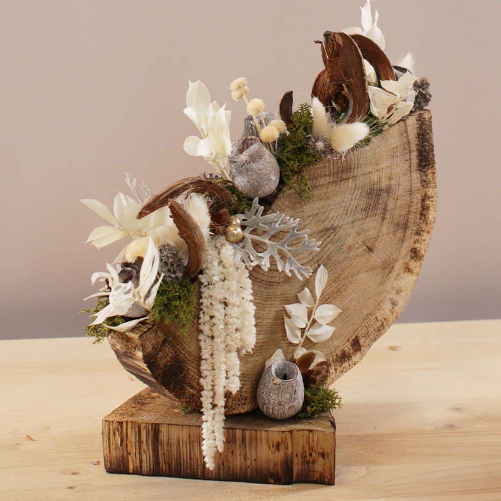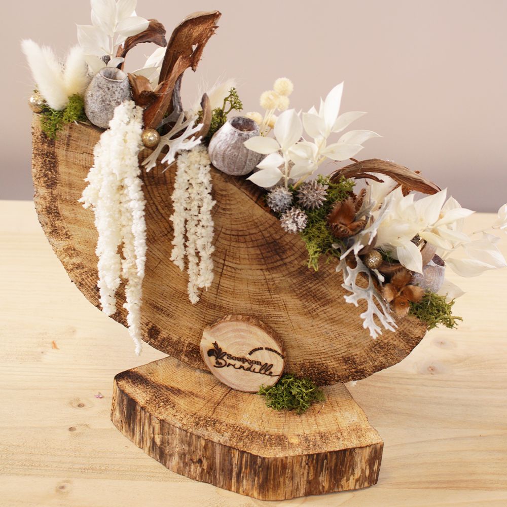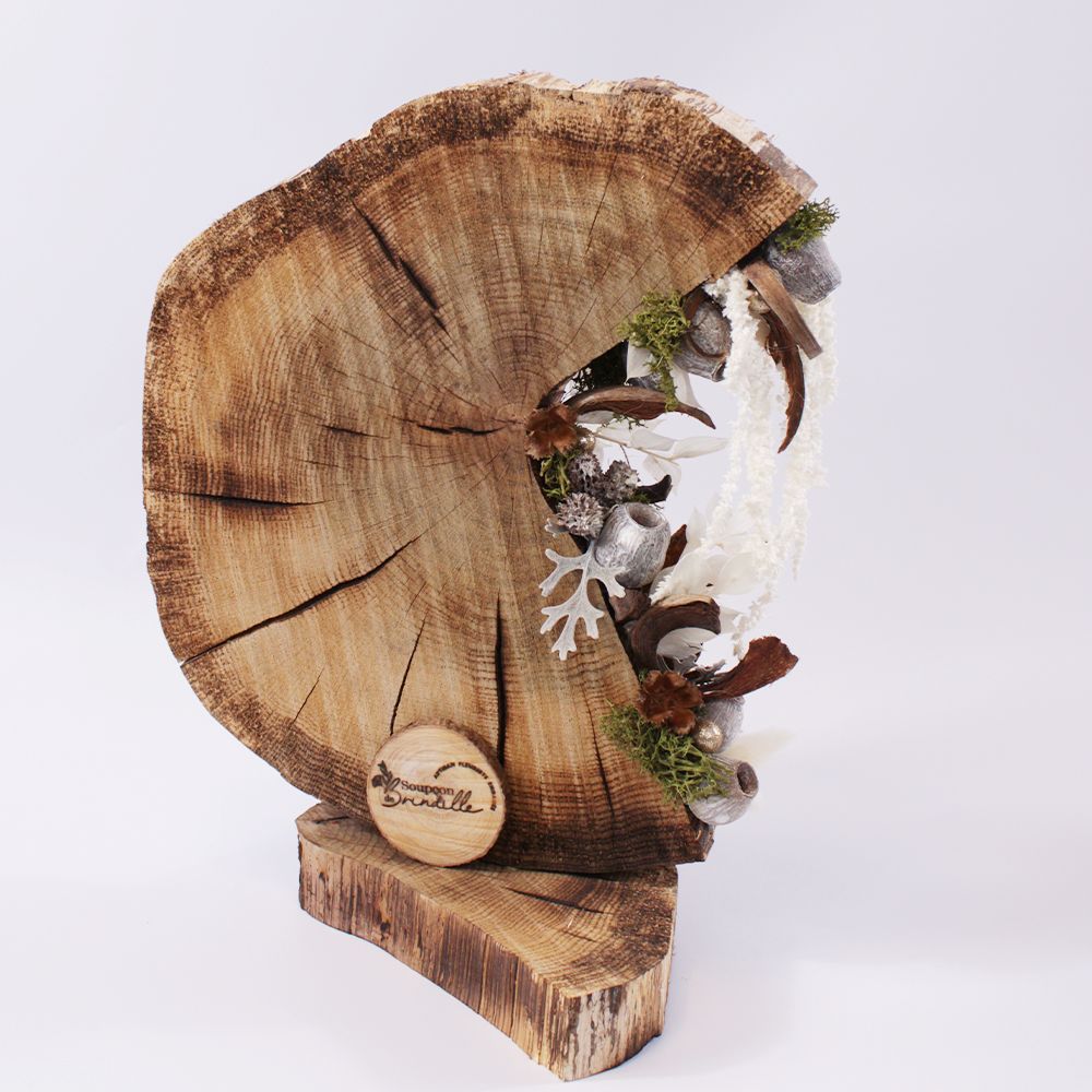 Découvrez Éclat d’Hiver, une décoration artisanale créée à partir d’un rondin de chêne brut associé à des éléments naturels séchés et stabilisés. Lichen, amarante, graines d’eucalyptus blanchis … et textures hivernales apportent douceur, authenticité et un charme givré à cette pièce unique.