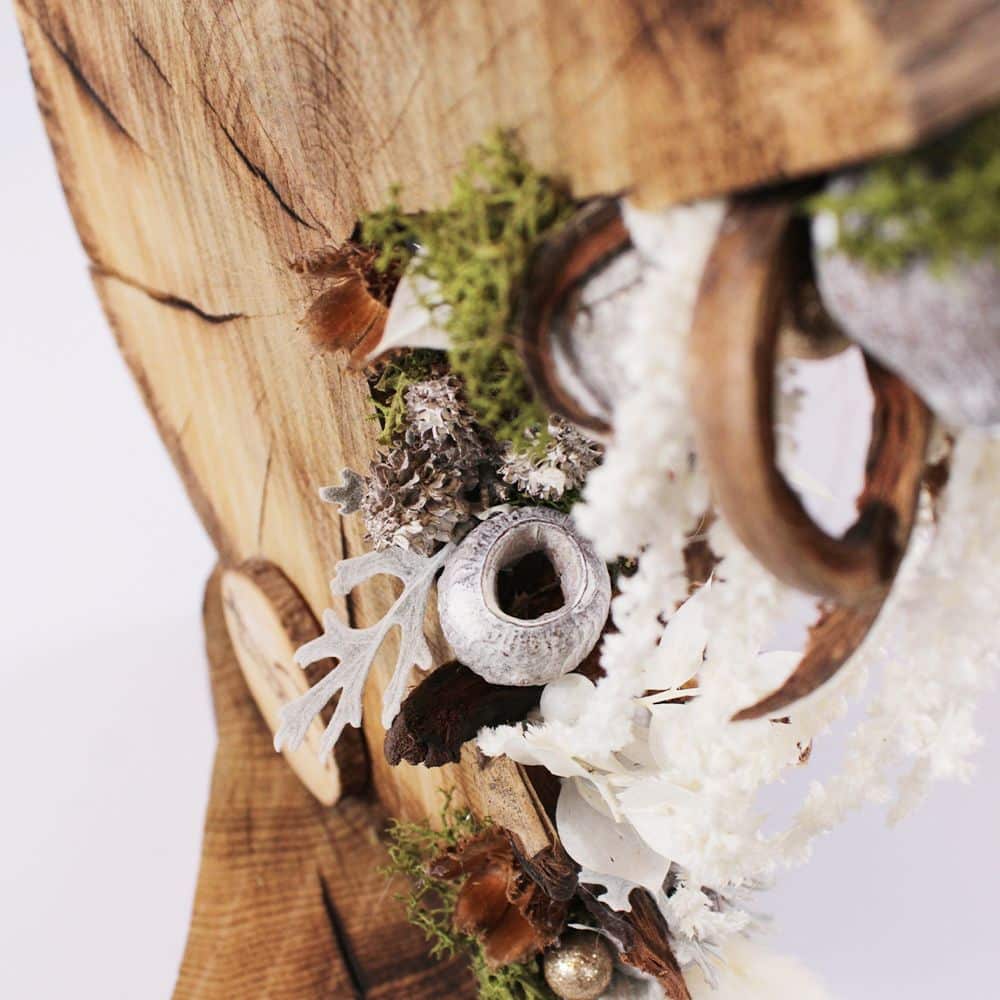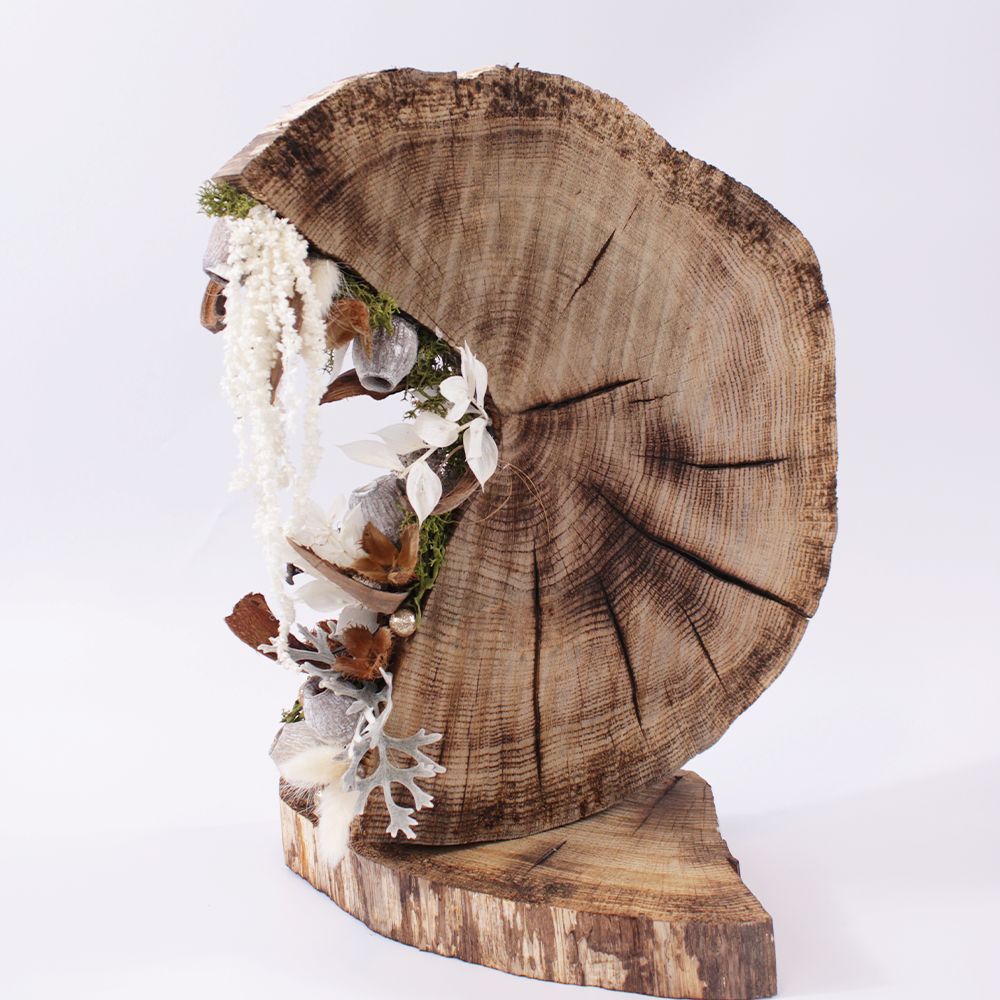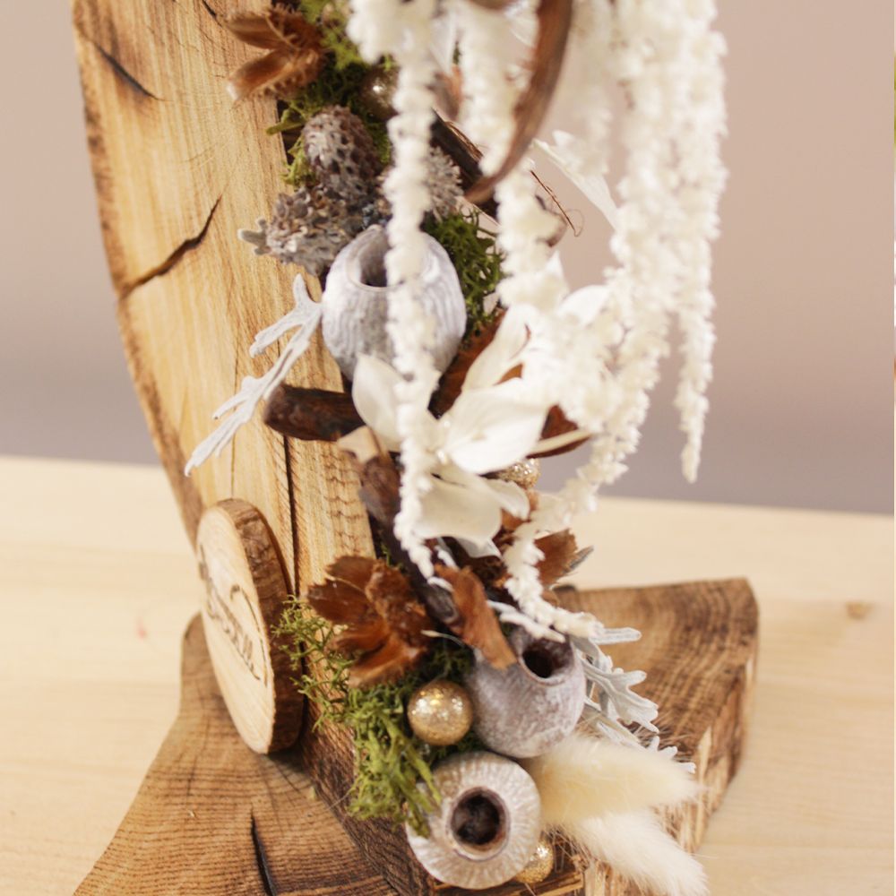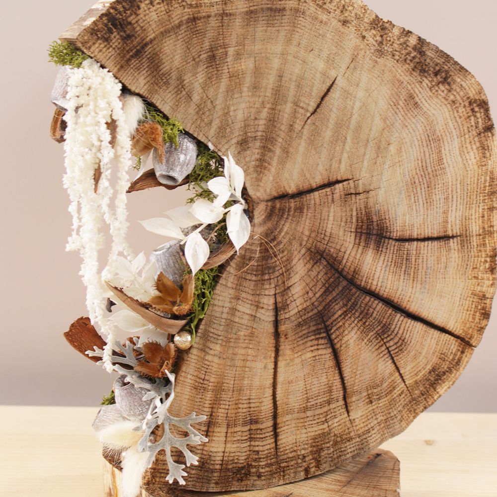 Éclat d’Hiver est une création artisanale en bois de chêne, décorée de végétaux séchés et stabilisés aux tonalités hivernales. Chaque élément, soigneusement choisi, met en valeur la beauté du naturel tout en évoquant la magie de l’hiver.