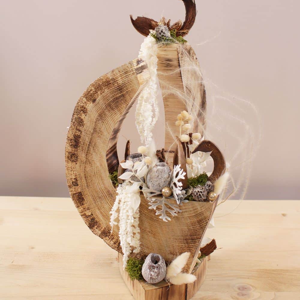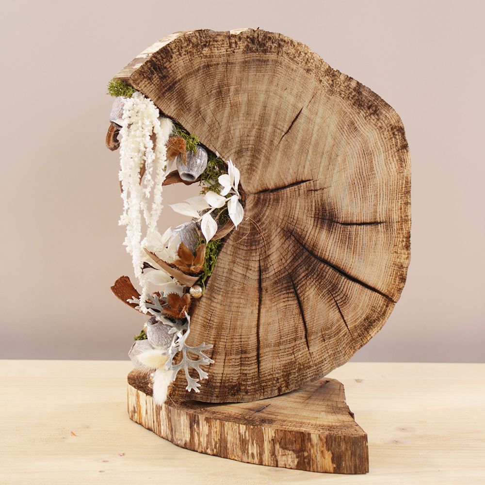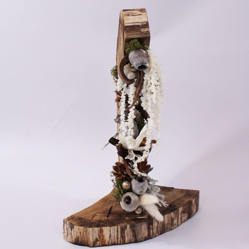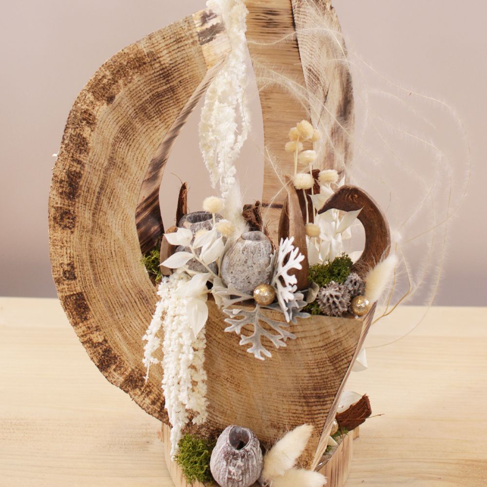 Éclat d’Hiver est une création artisanale en bois de chêne, décorée de végétaux séchés et stabilisés aux tonalités hivernales. Chaque élément, soigneusement choisi, met en valeur la beauté du naturel tout en évoquant la magie de l’hiver.