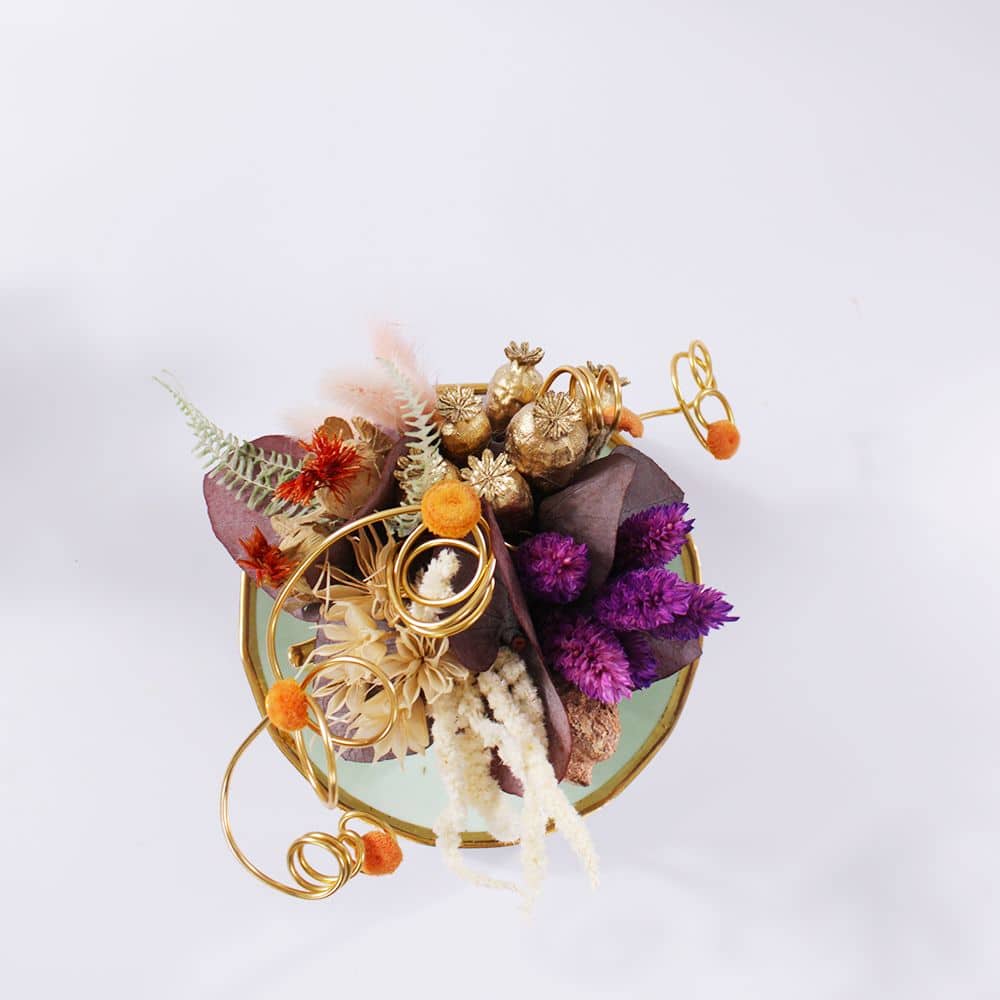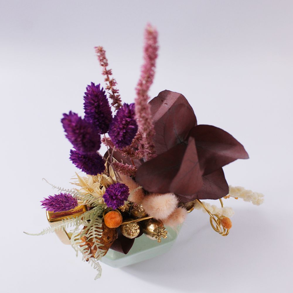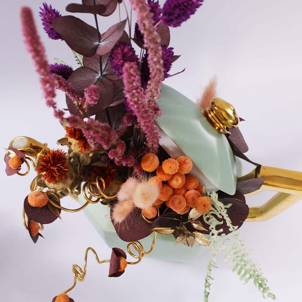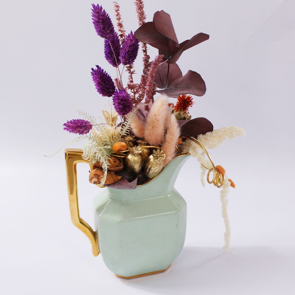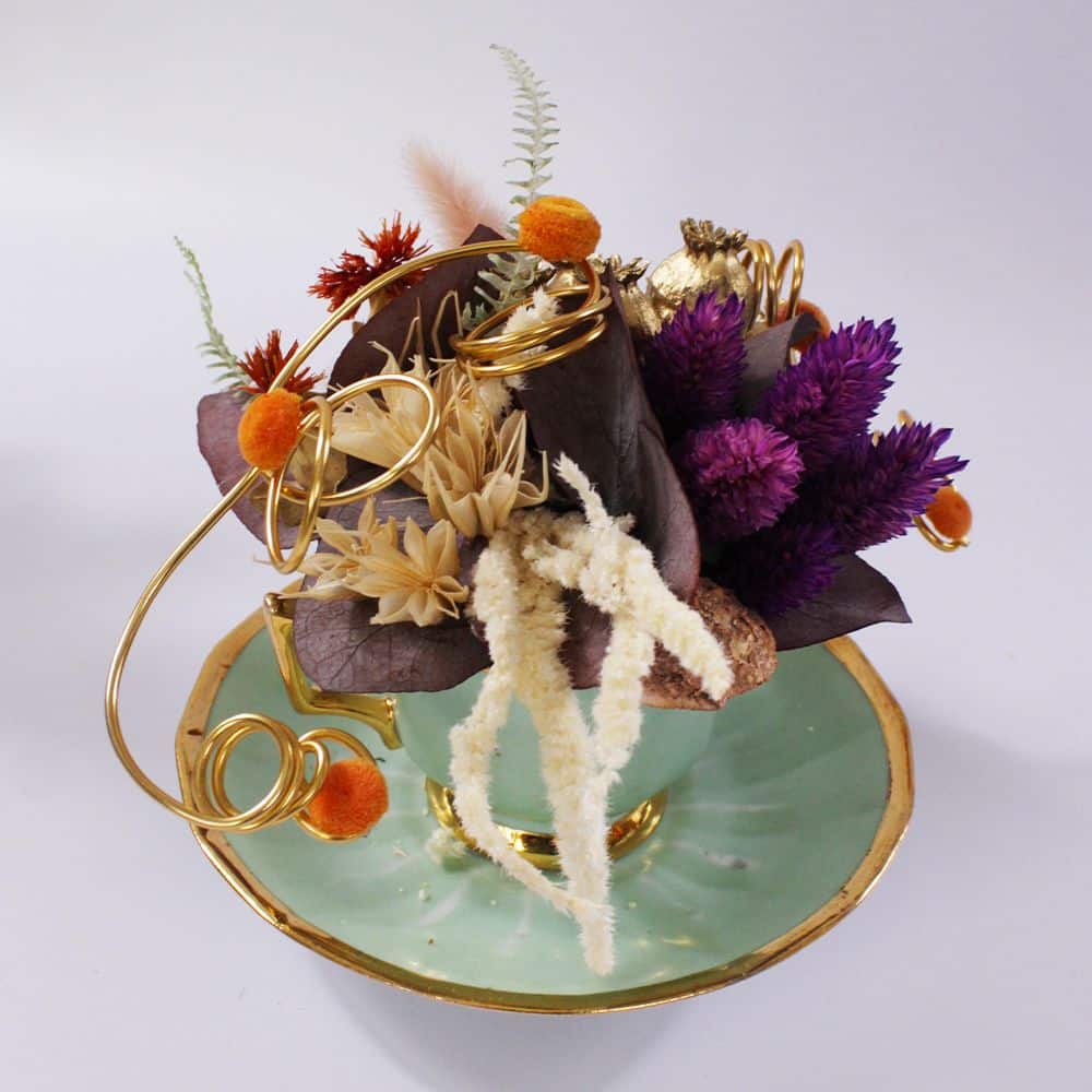 Dans un délicat service à thé aux douces nuances de vert clair ,comprenant théière, tasse, pot à lait et des pièces chinées avec soin .Se niche un petit jardin, à l’image des services que l’on retrouvait chez nos grands-mères. Fleurs séchées colorées et eucalyptus stabilisés y créent une harmonie intemporelle, rappelant les après-midis paisibles et les instants précieux d’antan.